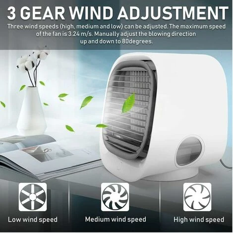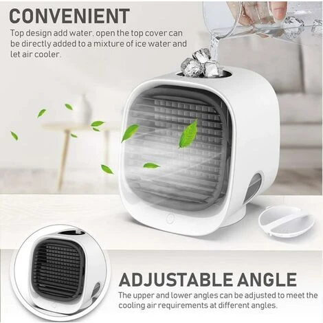 Mini Climatiseur 1.Ce climatiseur portable peut refroidir, humidifier et nettoyer l’air autour de vous. Ils sont faciles à utiliser et peuvent remplir l’eau froide de glaons pour humidifier l’air de refroidissement avec du brouillard. Vous pouvez également
