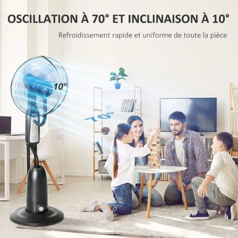 – Mobile, oscillant, tête inclinable : ventilateur brumisateur oscillant (70° max.) inclinable (10° max.) sur roulettes vous permettant de rafraichir plus facilement la zone de votre choix