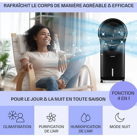 RAFRAICHISSEUR D’AIR MULTIFONCTIONS 3 EN 1 : Ce climatiseur mobile silencieux 3 en 1 Klarstein contient un ventilateur, un humidificateur et un rafraîchisseur d’air. Il vous suffit de l’allumer pour vous rafraîchir n’importe où dans la maison.