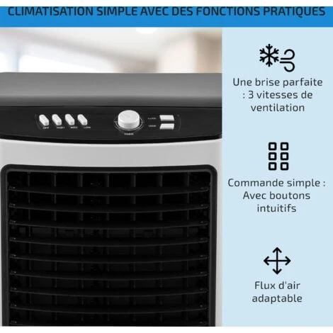 PLUS DE FRAICHEUR : Grâce à la combinaison de l’évaporation et de l’aspiration de l’air chaud, ce climatiseur portable vous aide à vous sentir plus au frais pendant l’été. Équipé d’un puissant ventilateur avec un débit d’air de 360 m³/h.