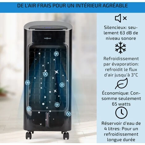 RAFRAICHISSEUR D’AIR MULTIFONCTIONS 4 EN 1 : Ce rafraîchisseur d’air fait circuler l’air frais dans la maison. Ce climatiseur mobile silencieux oneConcept contient un humidificateur et émet des ions négatifs pour éliminer les polluants et allergènes.