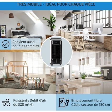 PLUS DE FRAICHEUR : Grâce à la combinaison de l’évaporation et de l’aspiration de l’air chaud, ce climatiseur portable vous aide à vous sentir plus au frais pendant l’été. Équipé d’un puissant ventilateur avec un débit d’air de 320 m³/h.
