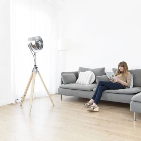 Ventilateur trépied en bois avec 3 pales de 12 pouces et un diamètre total de 30 cm. Moteur en cuivre de 80 W avec 3 vitesses. Hauteur ajustable 115 à 130 cm et inclinaison jusqu’à 80º. Design élégant. Ventilateur de grande puissance (80 W) pour que votre pièce soit parfaitement et instantanément ventilée. Moteur 100 % en cuivre qui apporte au ventilateur de la qualité et durabilité. De plus, il travaille aussi la puissance de ventilation. Le ventilateur possède 3 pales avec une aérodynamique parfaite qui permet d’obtenir une parfaite distribution de l’air. Les 12 pouces (30 cm) de diamètre des pales permettent d’obtenir un grand flux d’air froid pour atteindre le niveau de ventilation souhaité. Il possède 3 vitesses de ventilation pour adapter sa puissance et son flux d’air aux besoins de l’utilisateur. Hauteur réglable de 115 à 130 cm qui permet de choisir la sortie d’air en fonction de la pièce où on se trouve : soit le salon, la salle à manger ou la chambre. 80º d’inclinaison qui permet de contrôler totalement la direction de l’air là où il se trouve. Son élégant trépied en bois permet de le placer dans n’importe quelle pièce, même en tant que complément. Unité du ventilateur Manuel d’instructions